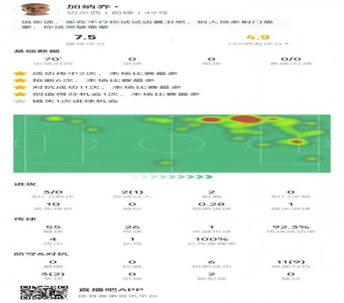 加纳乔数据:3次射门0射正,抢断6次+对抗成功11次,获评7.5分