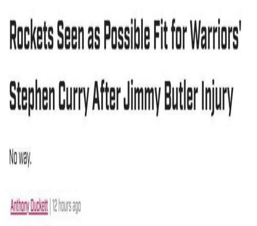 《CBS Sports》的Sam Quinn就支招火箭队趁乱交易库里,他认为巴特勒赛季报销后,勇士队已经无法帮助库里竞争冠军,如果库里仍希望赢得冠军,那么加盟休城携手老队友杜兰特将是绝佳的选择。