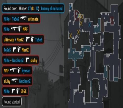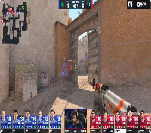 关键第18回合,Niko手枪埋伏B大门57双杀后捡到AK再轰双杀,单局四杀强势翻盘,为Falcons拿到第10分。