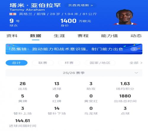 亚伯拉罕现年28岁,他此前被罗马外租至贝西克塔斯,协议中包含强制买断条款。他本赛季代表贝西克塔斯出战26场13球3助,他现身价1400万欧。